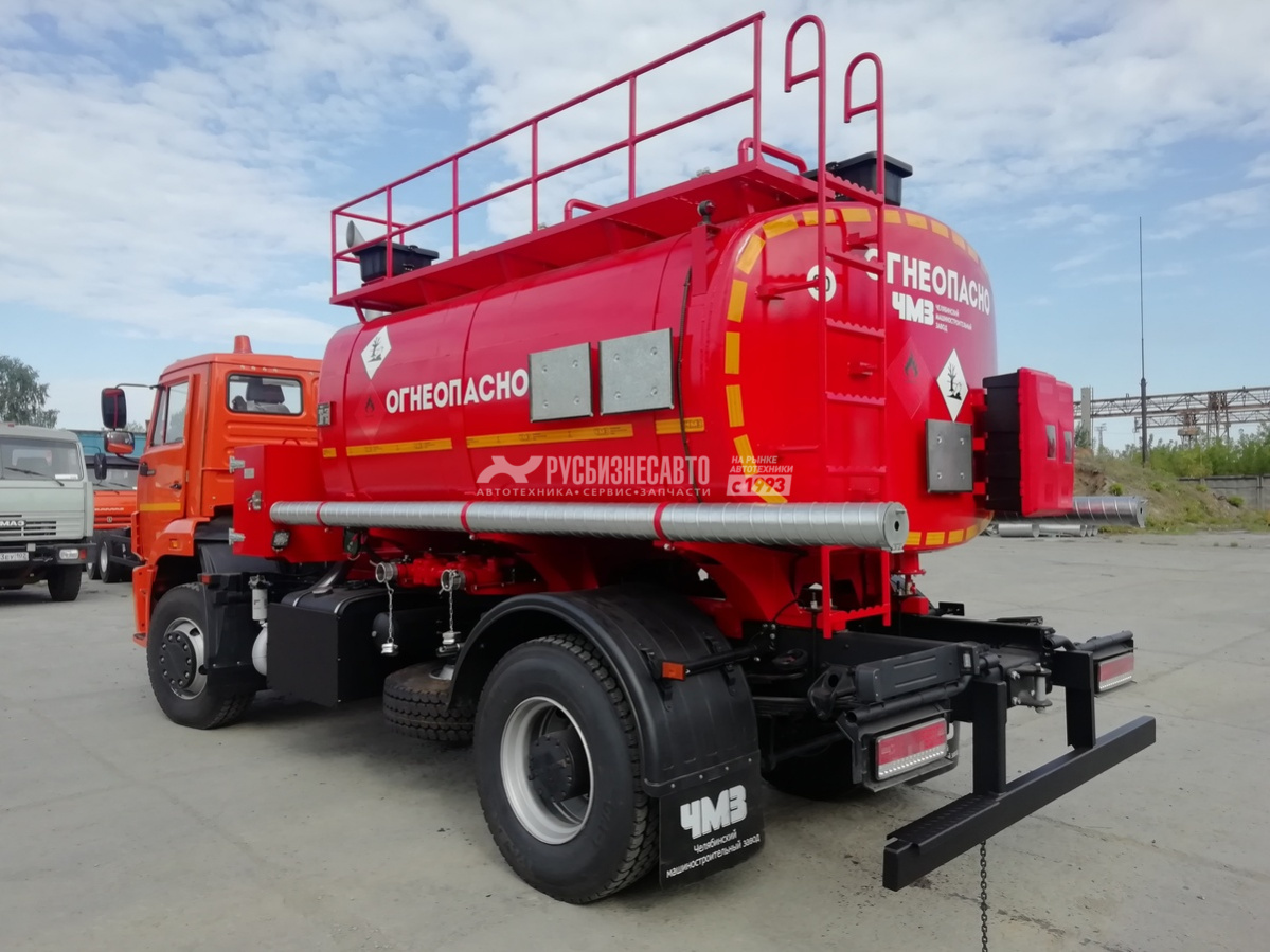 Автотопливозаправщик АТЗ 10 на давальческое шасси КАМАЗ-53605-3952-48  48 (ДВС 667 КПП ZF9) с ДЗК Цистерна    Сталь 09Г2С, толщина обечайки и днищ 4 мм; Сечение цистерны    Чемодан Количество секций    2 Объем цистерны    10 м3 Максимальная плотность перевозимой жидкости    0,86 Горловина цистерны    Алюминиевая крышка горловины с защитной дугой на каждую секцию, оборудована лестницей и площадкой для обслуживания Насос топливный    СВН-80 Тип привода насоса    от КОМ Узел выдачи (отсек):    - счётчик жидкости ППО-25 - пистолет РП-20 или аналог; - шланг Ду-25 антистатический 6 метров - фильтры тонкой очистки Напорно-всасывающие рукава    2 шт. – Ду 75 мм, длина 4 м с БРС Способ укладки рукавов     Оцинкованные пеналы по обеим сторонам цистерны, Крылья    Пластиковые с креплениями ДЗК на заднем свесе    наличие Донный клапан    ДКП-90 Дыхательный клапан    УД-2-80 2. Окраска навесного оборудования Наружная поверхность цистерны    Оранжевый Логотипы (надписи) на цистерне    ОГНЕОПАСНО 3. Средства безопасности Защита топливных баков    наличие Экранировани