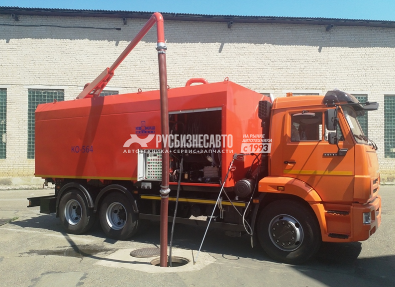 - На машине КО-564 для удаления твердых отложений со стенок трубопроводов применяется метод пневмоимпульсной очистки, основанный на использовании энергии сжатого воздуха, создающей в трубопроводе импульсные воздействия на стенки, в результате которых твердые отложения разрушаются и отслаиваются от стенок труб в интервале обработки.   - Предусмотрен подогрев баков с технологической водой, цистерны для ила и отсека с оборудованием. - Модель шасси - КамАЗ-65115-4081-56 - Масса машины полная, кг – 25200 - Вместимость цистерны, м3 - 6 - Масса загружаемого в цистерну ила, кг - 9710 - Вместимость водяных баков, м3, - 5,45 - Производительность вакуумного насоса DL-150, м3/ч - 900 - Разрежение, создаваемое вакуумным насосом, МПа, не менее - 0,08 - Производительность насоса высокого давления, м3/ч - 12,7 - Давление воды, создаваемое насосом высокого давления, Мпа - 16 - Глубина очищаемого колодца, 8 м. - Диаметр очищаемых труб, мм - 150 - 1000 - Длина рукава высокого давления, м - до 100