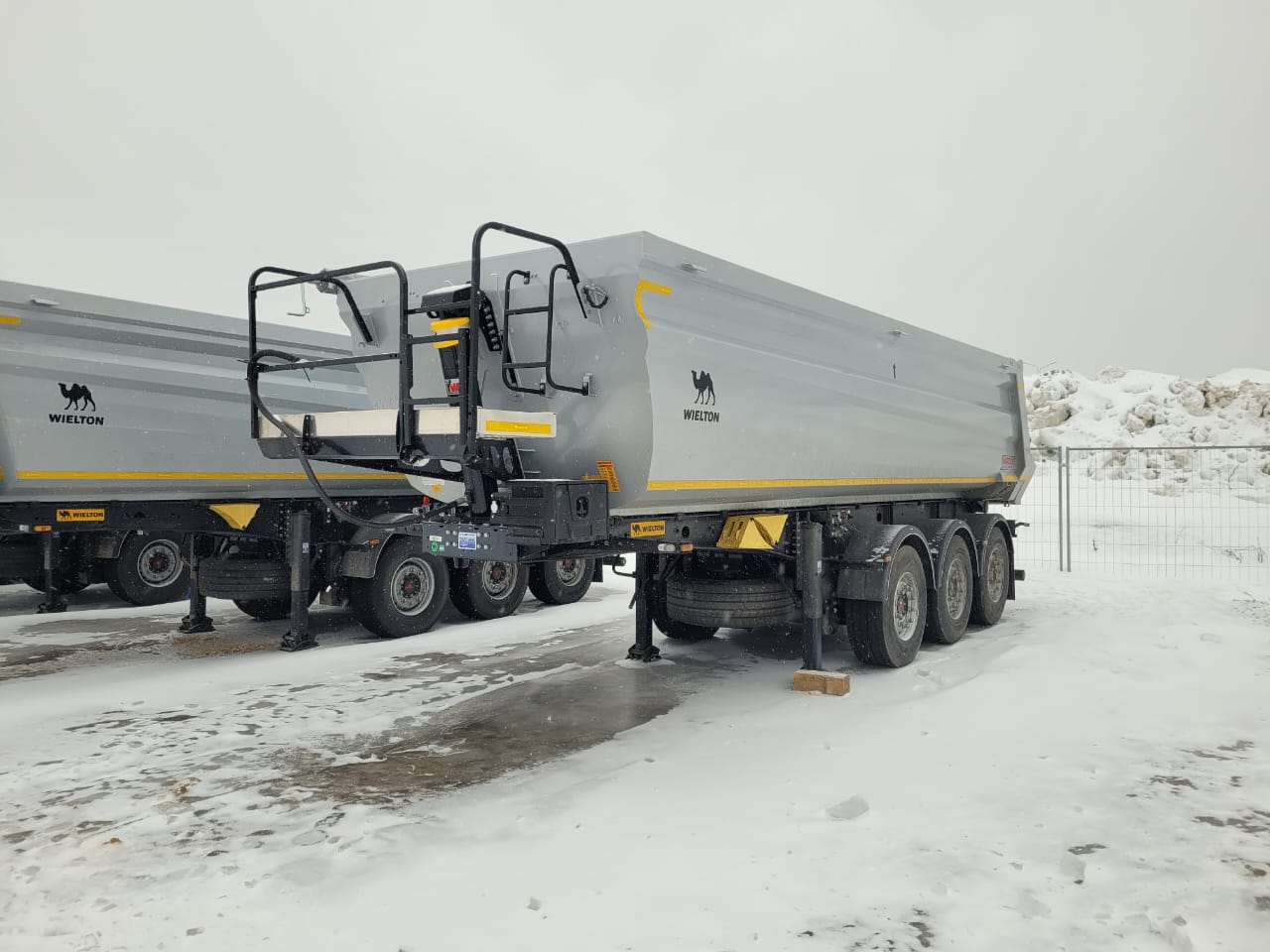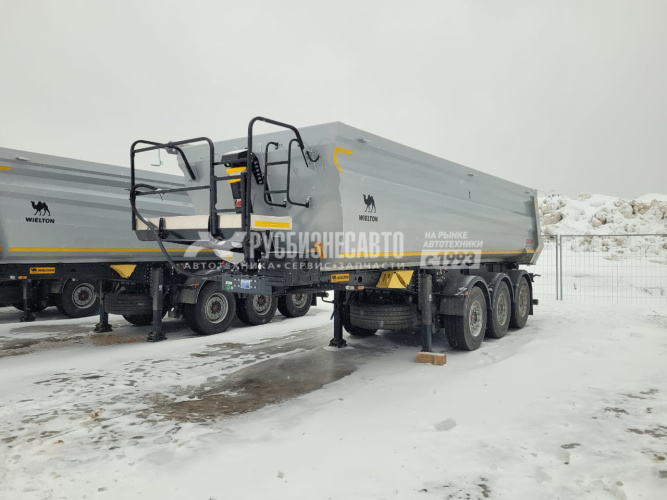 Cамосвальный стальной полуприцеп Wielton NW3S28KK объемом 28 м3, ССУ 1200, оси JOST - 9000 кг, дисковые тормоза, автоматическая передняя подъемная ось, грузовой отсек изготовлен из листового металла HB 450 стены – 3 мм, пол – 4 мм, задний затвор - откидной борт, шины 385/65 R 22,5, собственнй вес 6700 кг, г/п - 32 300 кг.
