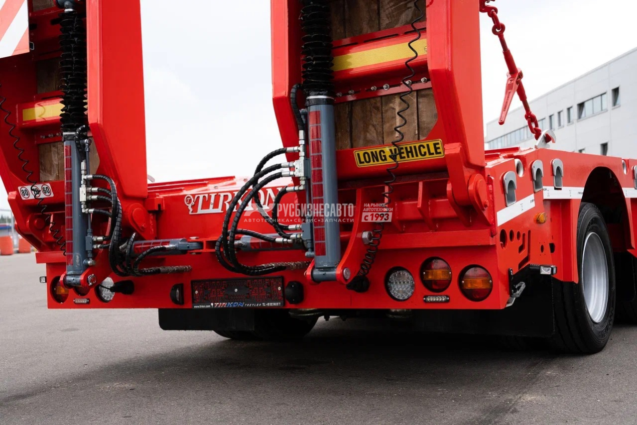 - Низкорамный трал TIRKON LWB5A - 5 осей Osman Kos грузоподъемность 12 тон - Тормозные система: Wabco 4S/3M, двухкамерные барабанные тормоза, действующие на все колеса с помощью S-образного кулачкового привода, двухканальная, электро- пневматическая, согласно UN ECE R13 - Пневмоподвеска с барабанными тормозами - Длина платформы погрузочная 11500 мм + 6000 мм - Габаритная длина в сложенном виде 15 994 мм - Раздвижной механизм с фиксацией раздвижения каждые 500 мм - Угол заезда на аппарели 10 градусов - 1-я ось подъемная - 4-ая и 5-ая подруливающие - Г/п 56 240 кг (по ЭПТС) - Г/п технически допустимая 63 000 кг - Собственная масса 16 760 кг - Ширина 2.550 мм (выдвижные уширители платформы с двух сторон + 250 мм, без настила) - Собственная гидростанция с работой от АКБ тягача (силовые провода в комплекте)